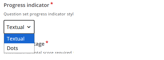 The number of questions in Question set can be shown by changing the "Progress Indicator" to "Textual" instead of "Dots". Based on the title of the questions in Question set there is an order to how the questions should appear. If this is the case you need to make sure that "Randomize Question" is unchecked.