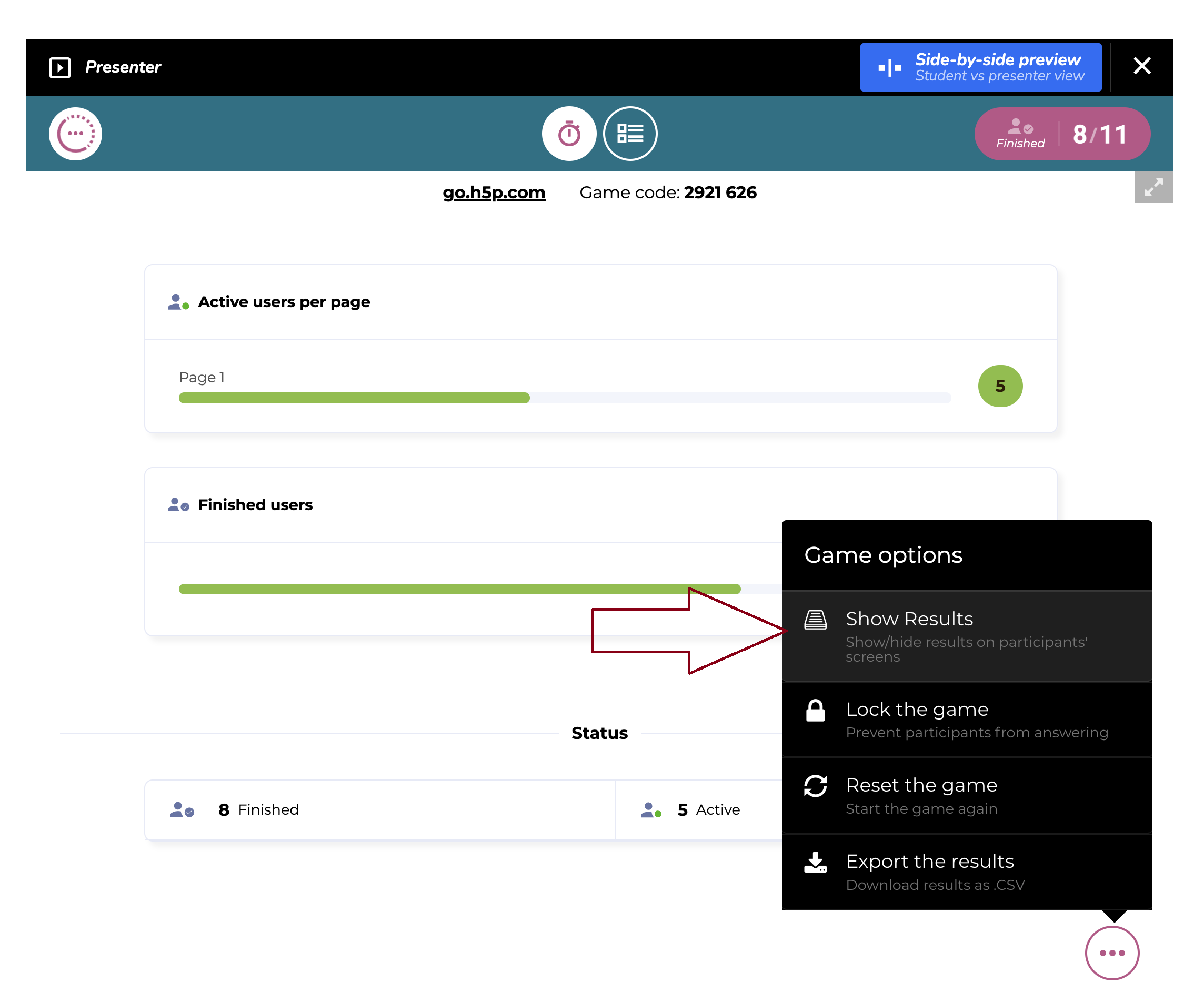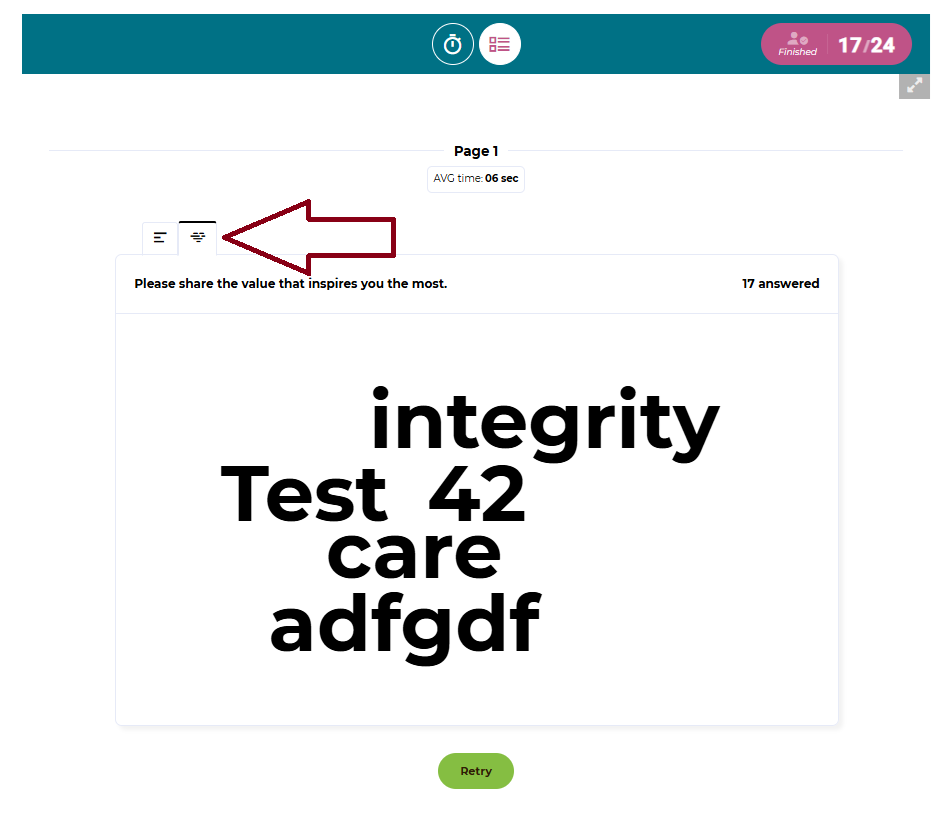 An indicator would be very helpful, but my settings look exactly as in the screenshot you shared. I tested again with that setting showing both "show" and "hide," but I still don't see the word cloud after submitting. So, with the setting as shown in your screenshot, I see "waiting for others to respond," and with the other option on, I see the presenter's view, but not the word cloud as in the demo you shared. As mentioned earlier, I tested in different browsers and incognito tabs. Nothing seems to bring up the word cloud for me. Here's my link with the updated setting https://unthsc.h5p.com/content/1292793390499913908. Thanks again for your help!