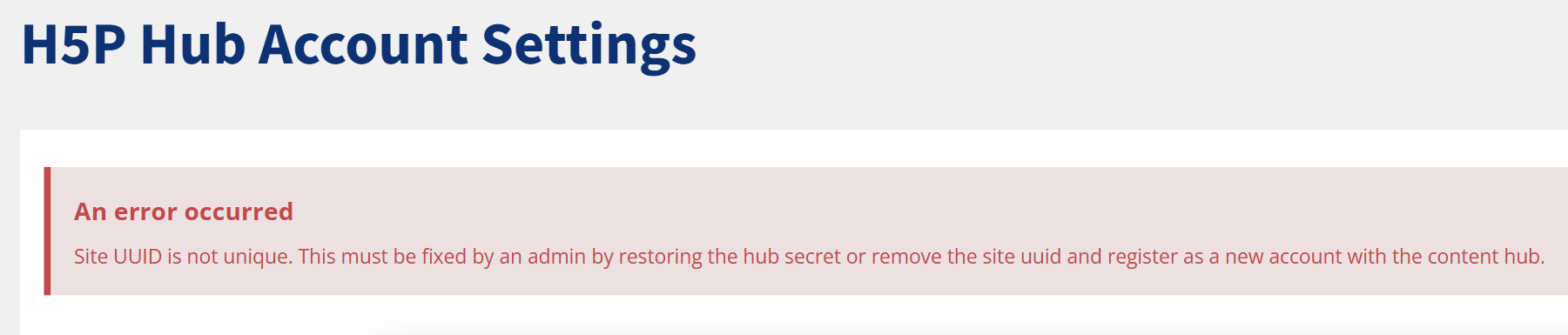 When you try to register with the H5P OER Hub and you receive that message, then it means that the H5P OER Hub already has a registered account with that UUID, but your plugin instance does not provide a hub secret.