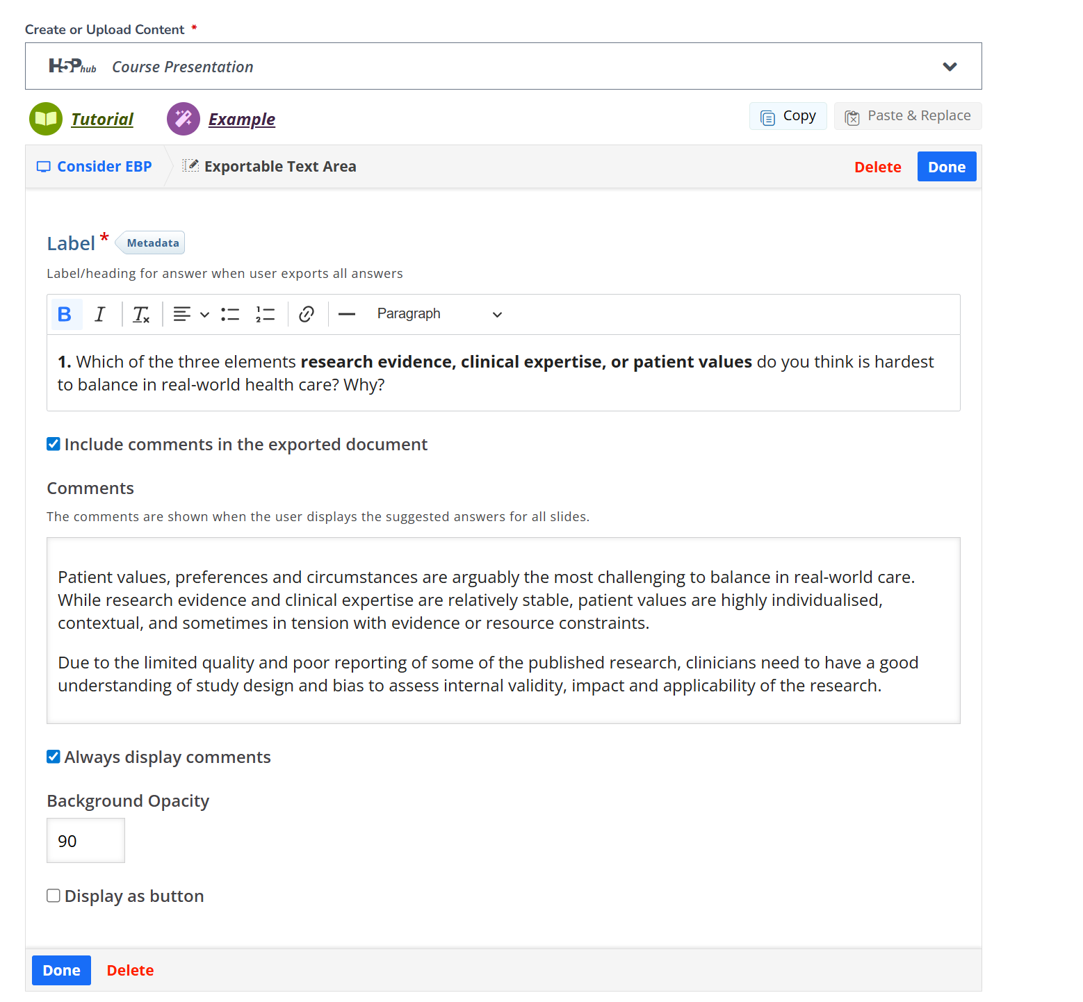 Add in feedback comments (comments are shown when user displays suggested answer for slide)